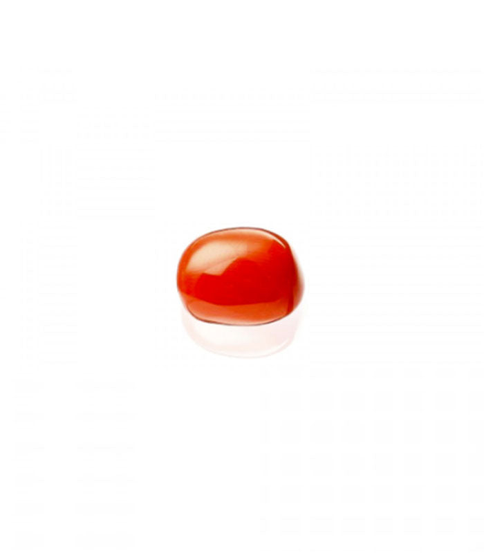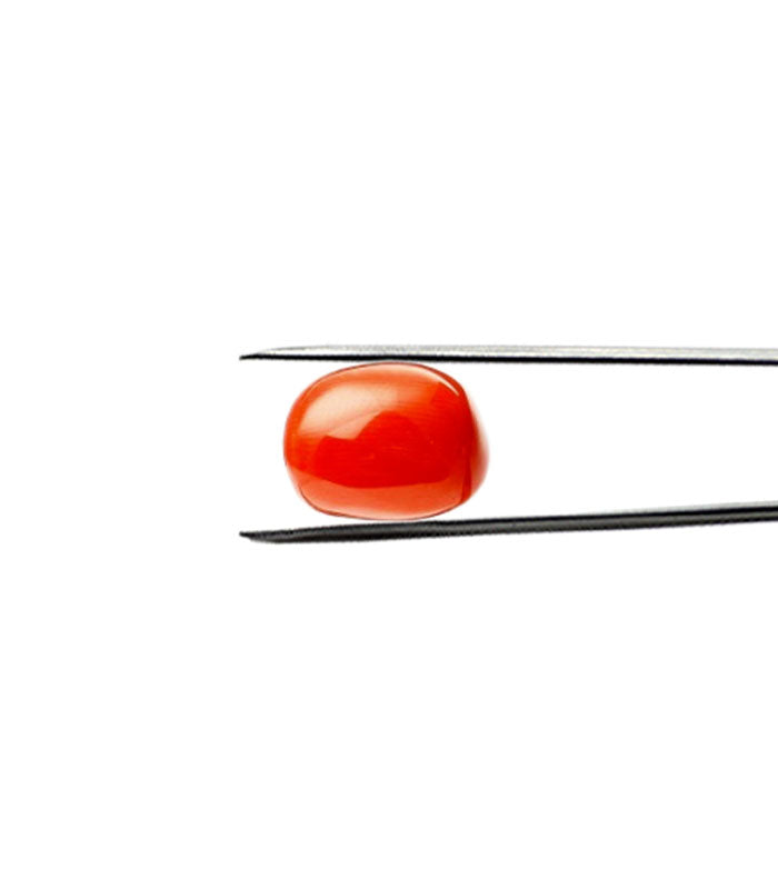 Beautiful lustrous orangish red colour, quality polished oval cabochon cut is the finest Red Coral originated from Italy.