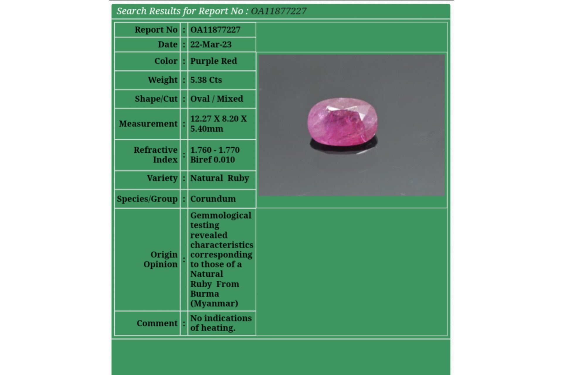 Expertly crafted in a classic oval cut, the ruby exhibits a radiant glow and superb brilliance under all lighting conditions. Completely unheated and untreated, it retains its original beauty and natural crystalline integrity — a rare quality that enhances both its gemstone and astrological value.